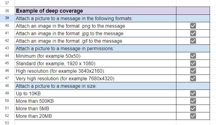 With such a checklist, a tester immediately comes up with multiple test scenarios that also need verification. Let’s expand them with an example of deeper coverage.