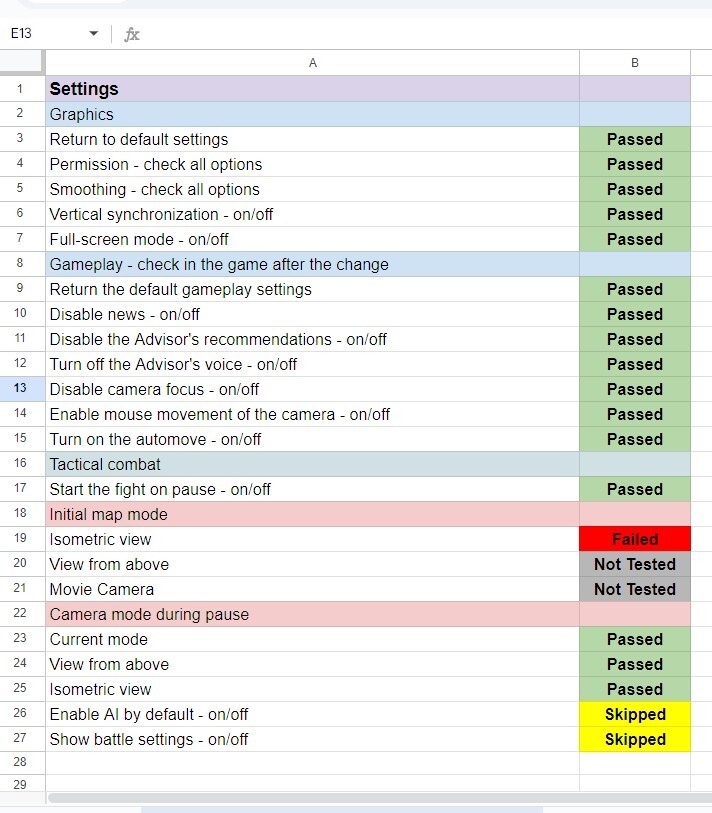 It is convenient when there is a “Status” field next to each check. The most common statuses we use are: Not Tested, Passed, Failed, Skipped. A “Comment” field is also very useful — for example, you can attach a bug link directly or explain why a check was skipped.