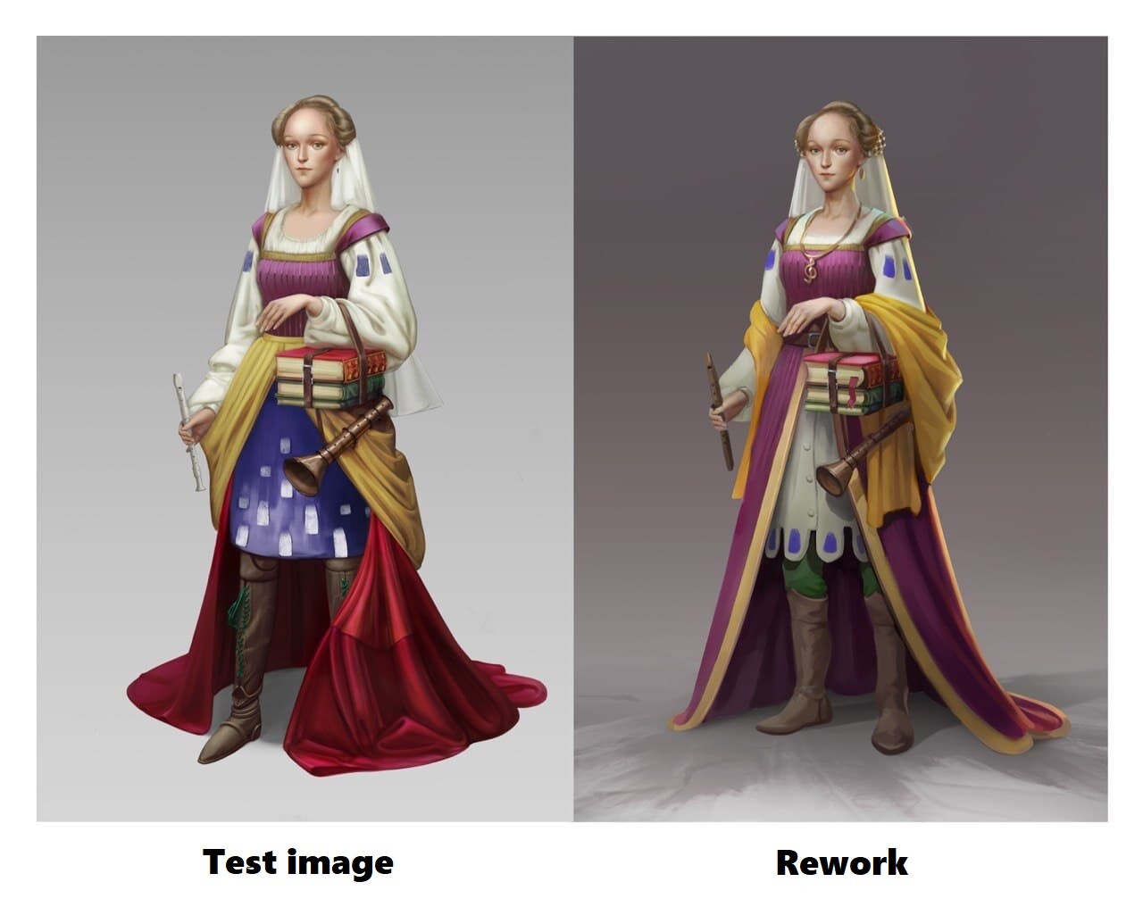First of all it is worth mentioning that this work portrays an interesting and expressive character executed in the correct style. The layered nature of the costume shows that there was a good effort made to make sure that the outfit is not overly sexualized as well. That said, however, there is a number of items that could be improved upon and we will focus our today’s discussion on them.
