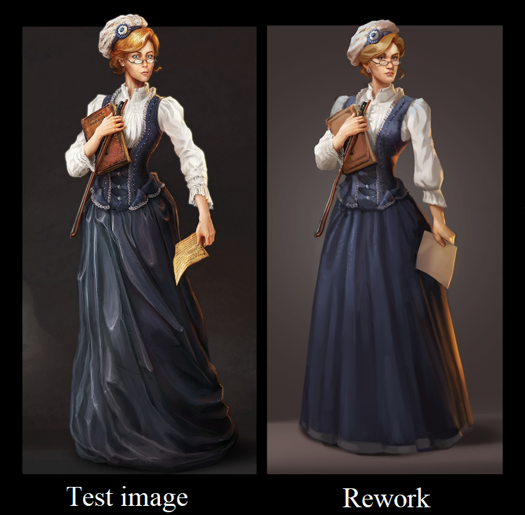 It's also not quite clear what the hair should have been like originally. The updated image has light-blond hair. But let’s take a look at the example with red hair. Even in the lightest part they will not be white. It is important to pay attention to this because otherwise the integrity of the tone is lost and the work start to "rattle".