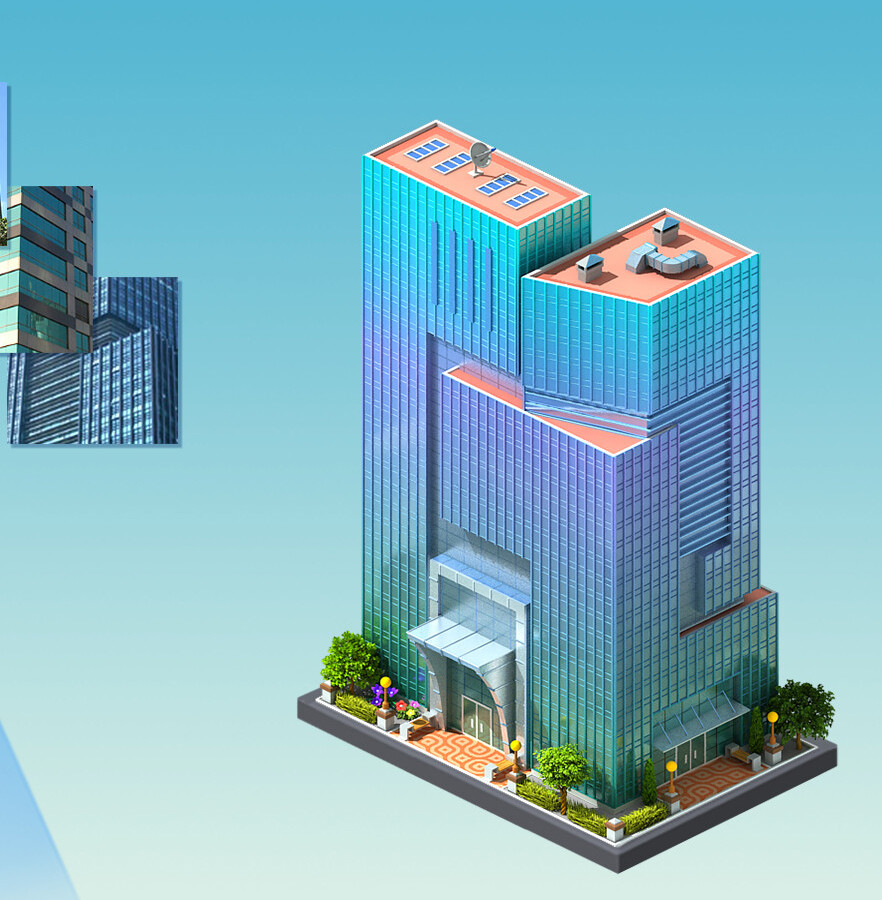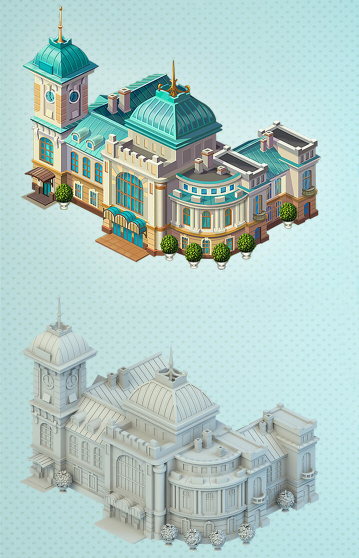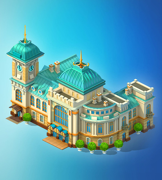 Game building for Megapolis. It was created by the SunStrike team based on photo references, without creating concepts. This complicated the task for 3D modelers, since they need to adapt the building to the game scale. Developer: Social Quantum