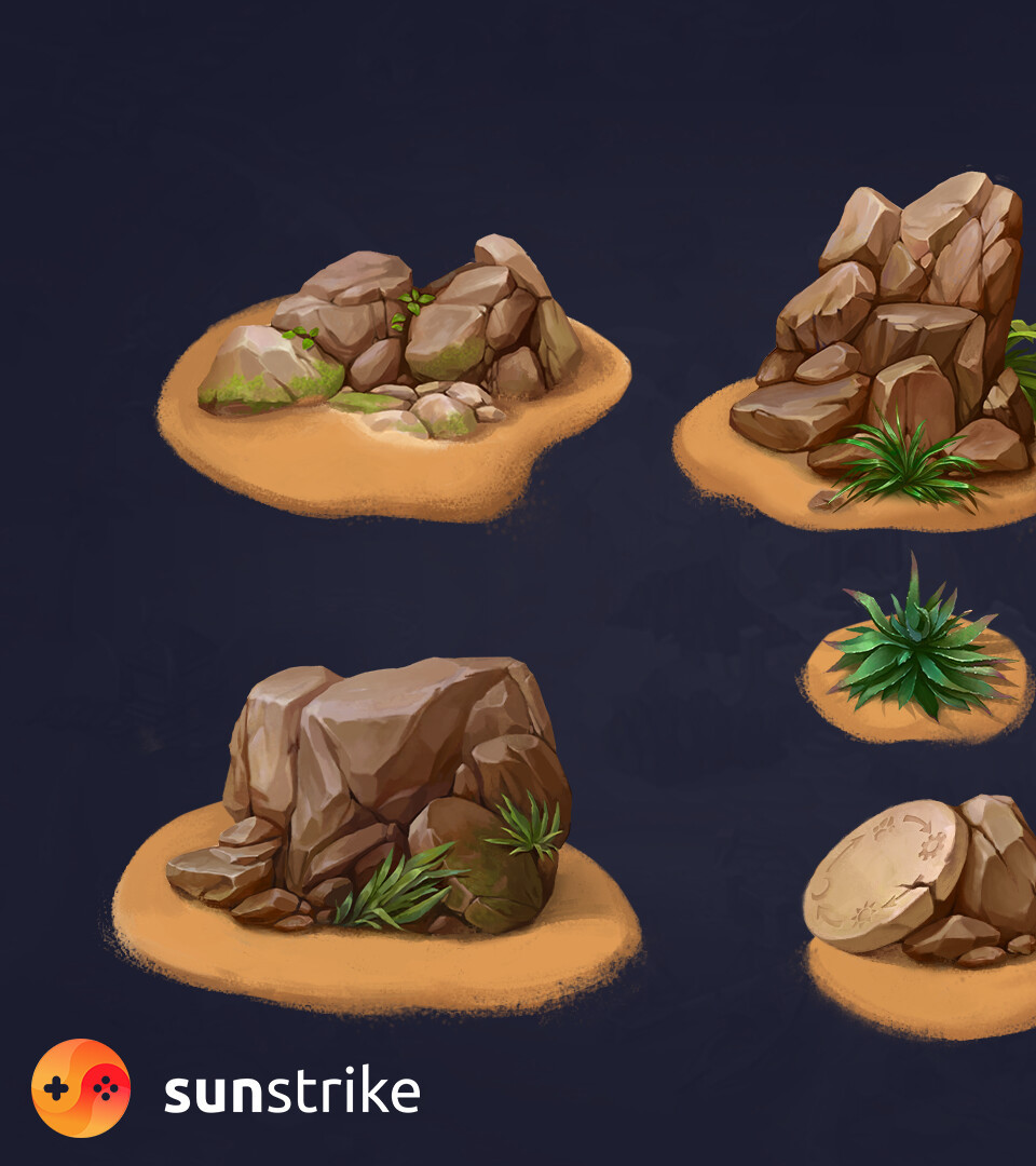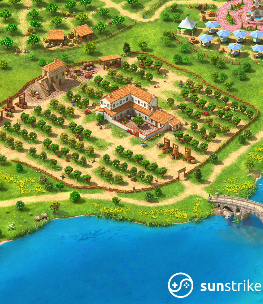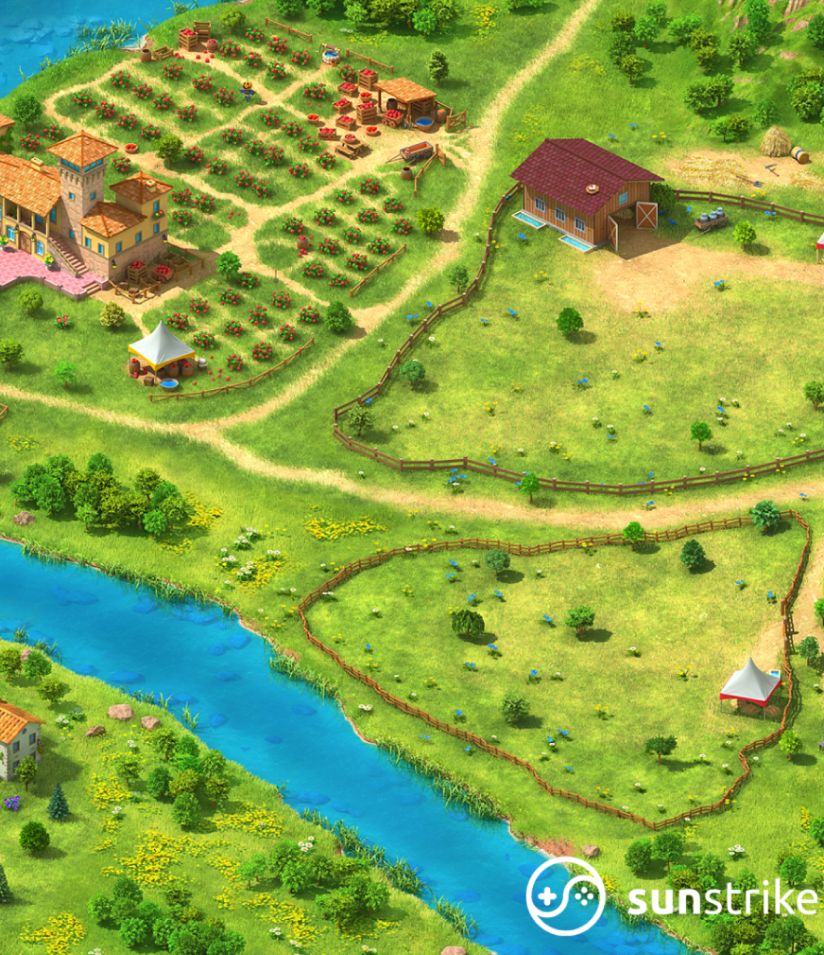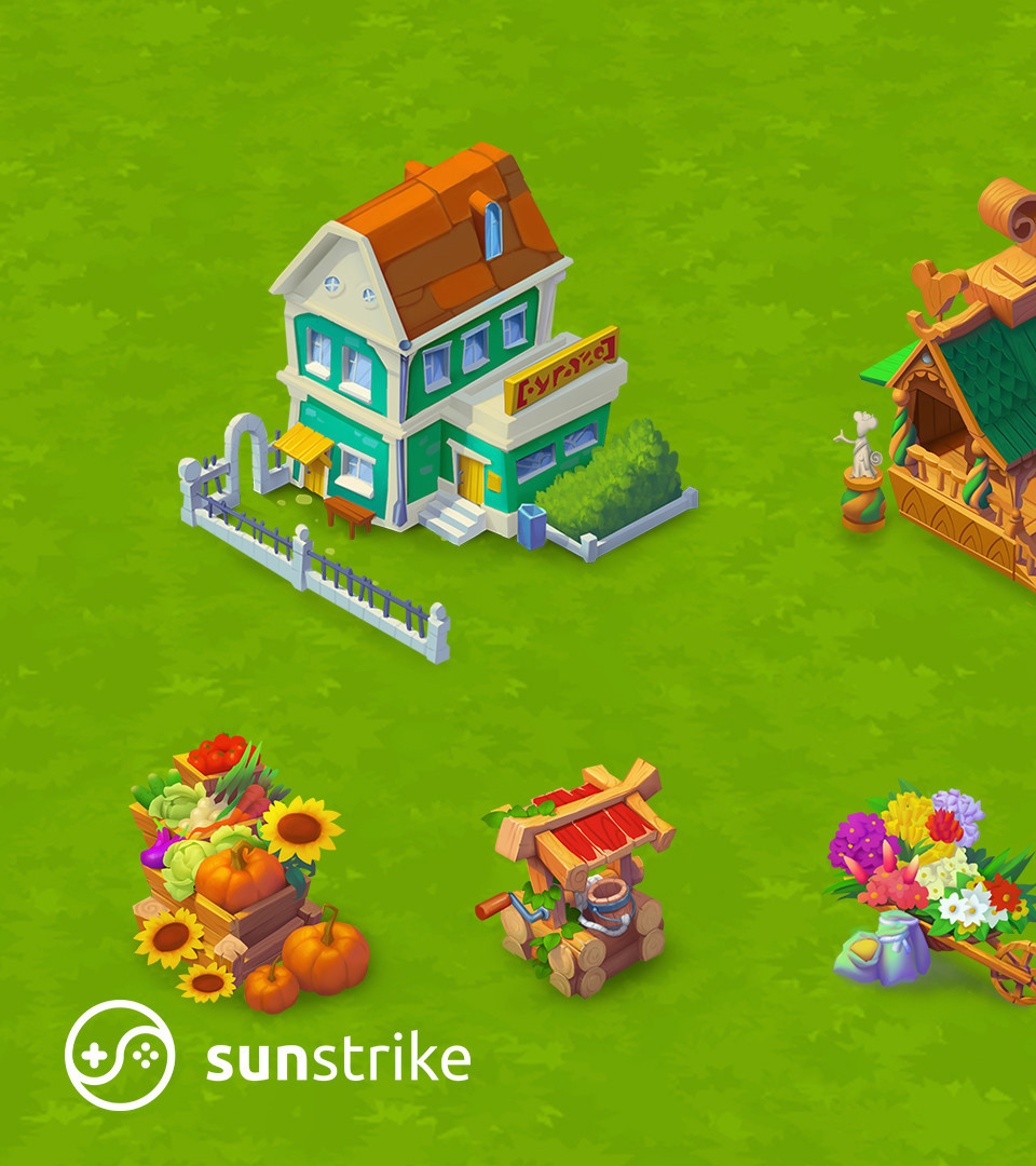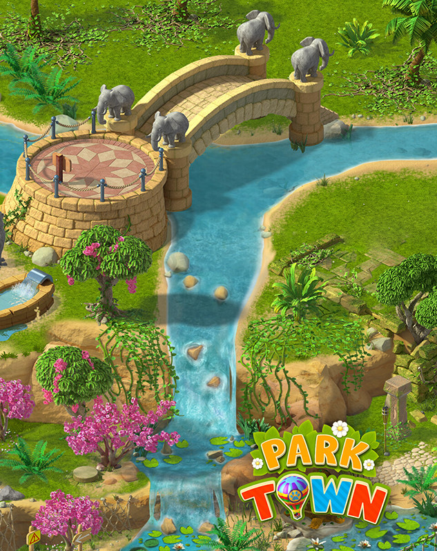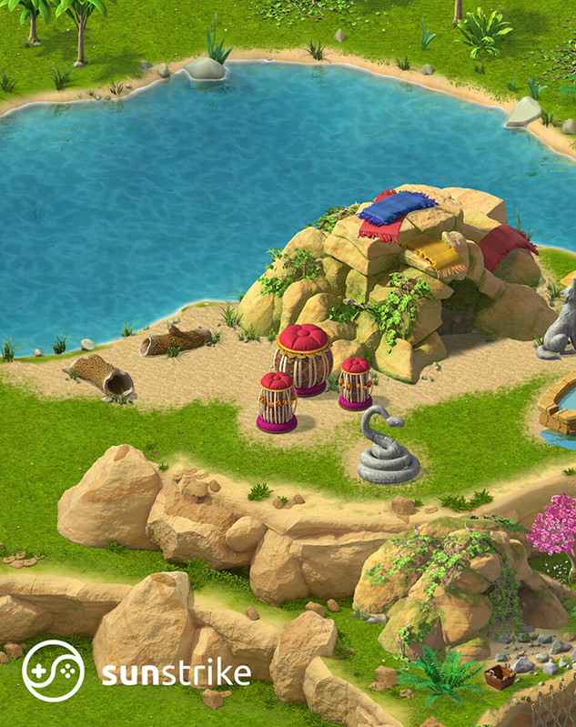 African location for Park Town. SunStrike artists drew a concept for the location, and 3D modelers created many game objects and environment objects. For almost every element of the location, several stages of upgrades were prepared. Our technical artists did a great job of assembling rendered objects together, creating the right hierarchy and naming the layers. Developer: Red Brix Wall