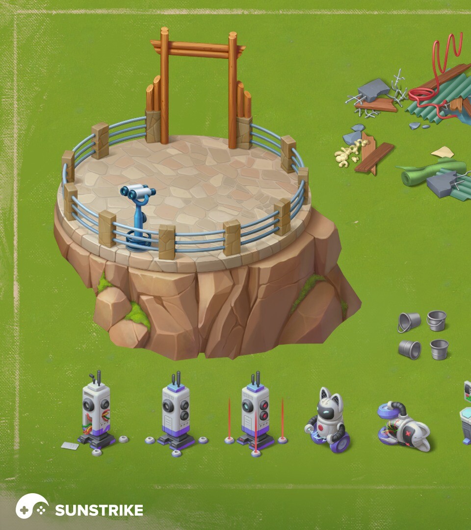 African location for Park Town. SunStrike artists drew a concept for the location, and 3D modelers created many game objects and environment objects. For almost every element of the location, several stages of upgrades were prepared. Our technical artists did a great job of assembling rendered objects together, creating the right hierarchy and naming the layers. Developer: Red Brix Wall