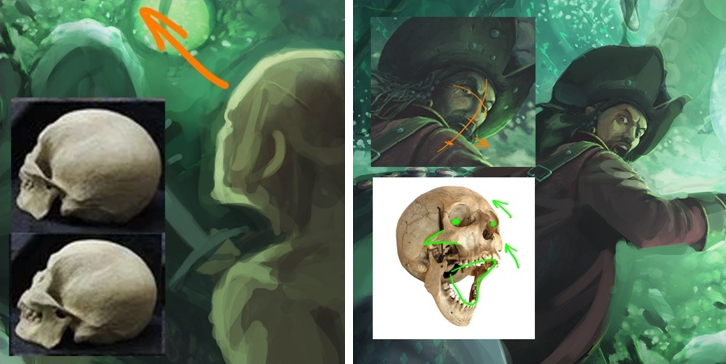 Анатомия. Если в иллюстрации используются сложные ракурсы, то лучше сначала изучить референсы фигуры и черепа. Это поможет определить, где должна находиться скуловая кость, как будет выступать челюсть, под каким углом будет расположен нос, и как в перспективе будут искажаться трети лица. У персонажа капитана главная ошибка — это как раз неправильные пропорции и черты лица, не подчиненные ракурсу. Нос получился слишком длинным, челюсть должна выступать вперед. Брови изогнуты слишком неестественно, лучше сделать их поспокойнее: