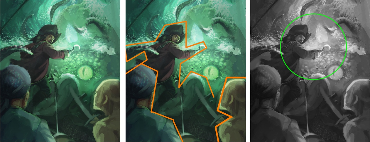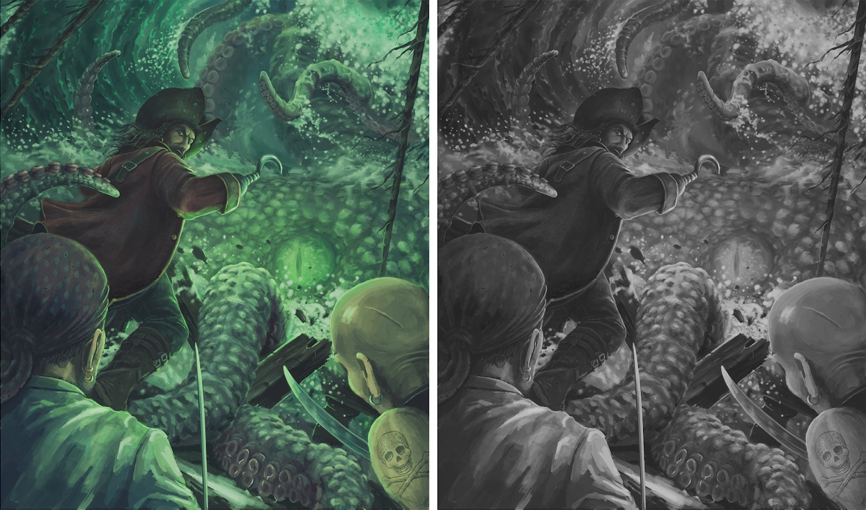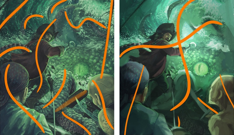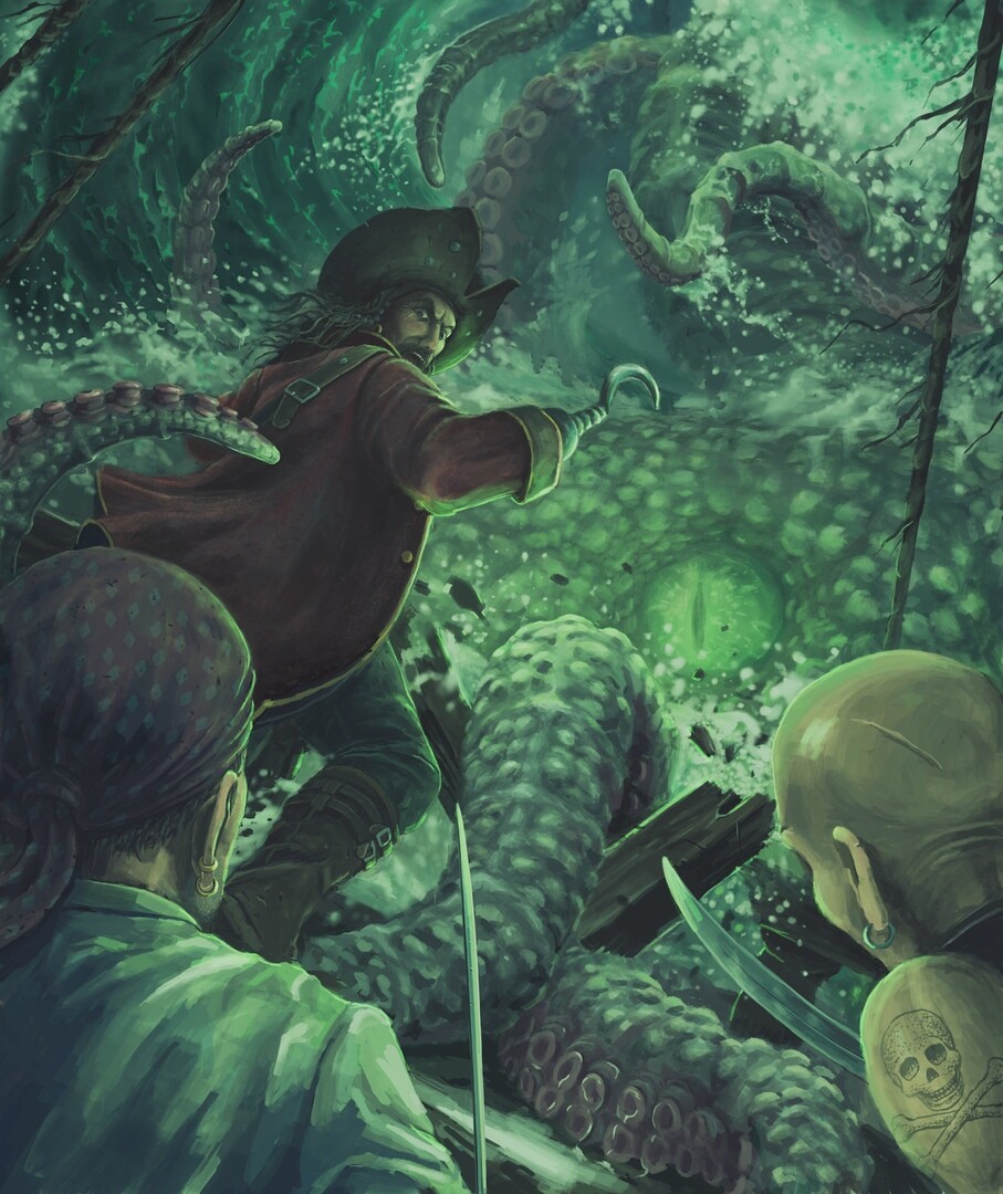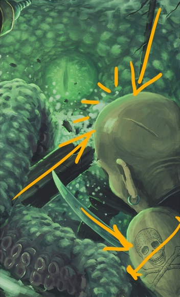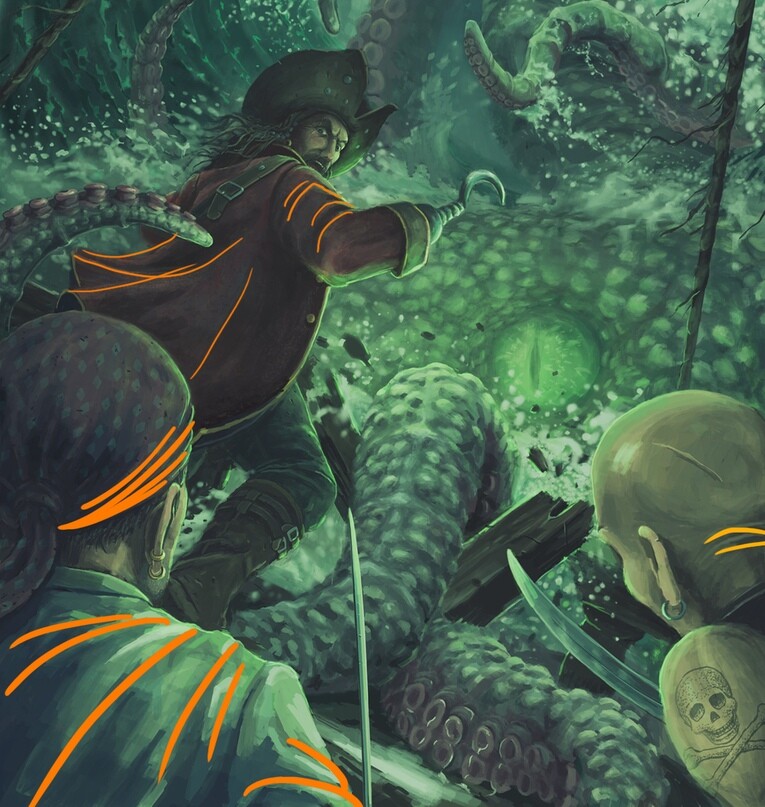 Композиция. Также на композицию влияют линии. Они направляют взгляд зрителя на главный объект в картине. В принципе, в этой иллюстрации довольно хорошо используются направляющие линии. Но из-за их количества, и того, что они раздроблены по тону, зрителю сложно воспринимать изображение. Видимых щупалец слишком много. Можно смело убрать 2-3 штуки, либо сделать их разными по контрастности. С точки зрения композиции правому пирату лучше бы смотреть на капитана, а не себе под ноги. Так как очевидно, что тот призывает команду сражаться: