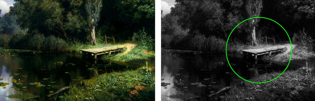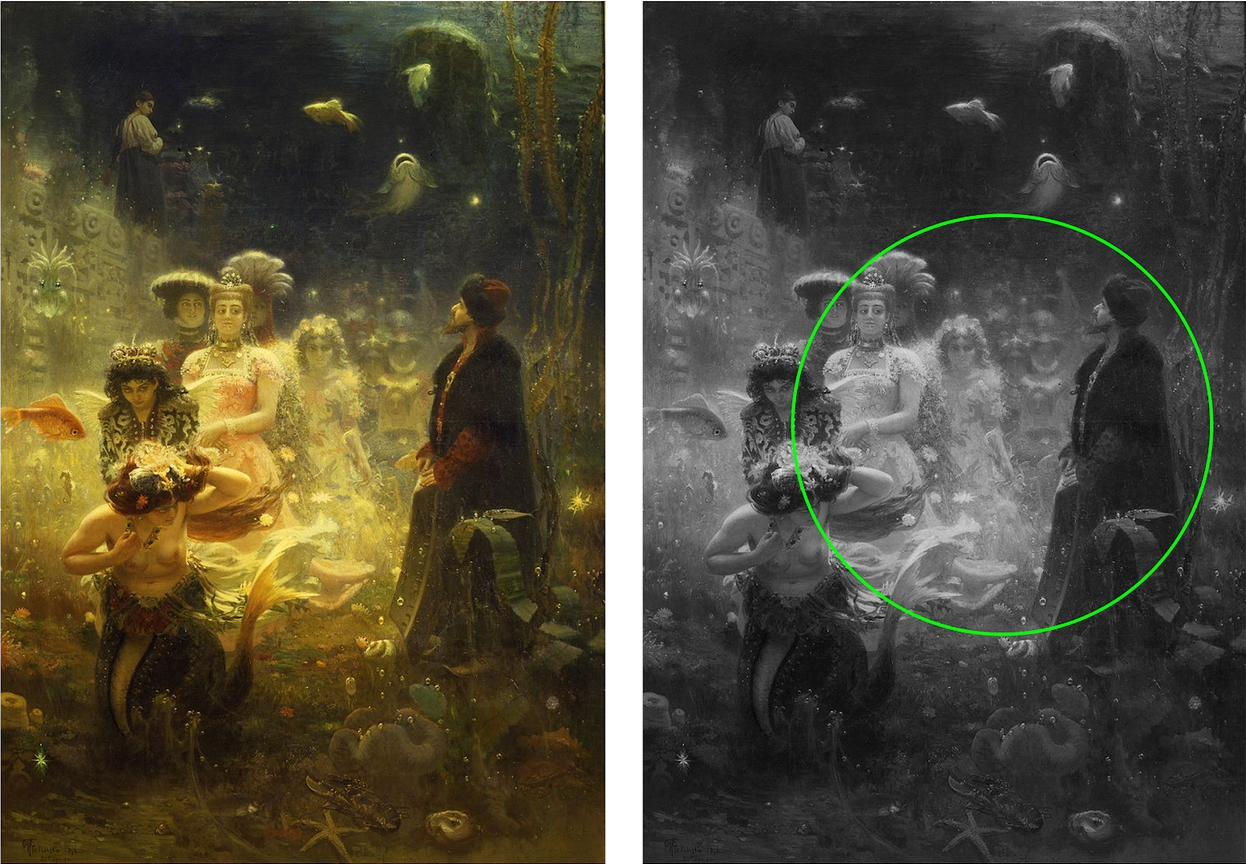Тон. Суть работы над иллюстрацией заключается в том, чтобы направить взгляд зрителя в нужную точку, показать центр композиции. В том числе с помощью контраста тона. Если мы посмотрим на работы мастеров в сближенной цветовой гамме в черно-белом цвете, то увидим, что в композиционном центре есть области фокусировки внимания, там используется более яркий контраст тона. Чем дальше от центра композиции, тем менее контрастным будет тон.