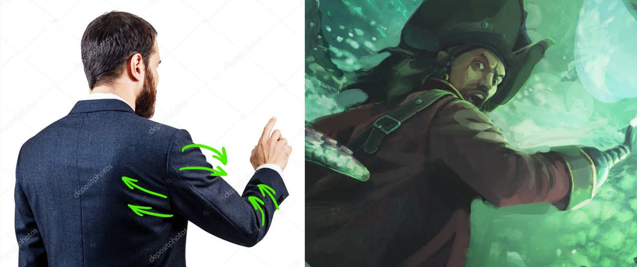 Складки на плечах пирата слева могли бы лежать так, как на иллюстрации, только если бы пират рукой схватился за рубашку на груди и тянул вниз. Поэтому лучше сделать их поспокойнее. На рукаве складки лежат в целом правильно, только нужно поаккуратнее, не такими грубыми мазками, показать объём. Касательно складок и царапины на голове пирата справа учитываем то, что складки кожи и царапины на теле человека имеют другие свойства, чем складки и царапины на предметах. Здесь нужно изучить референсы: