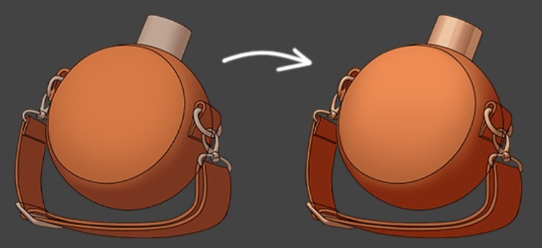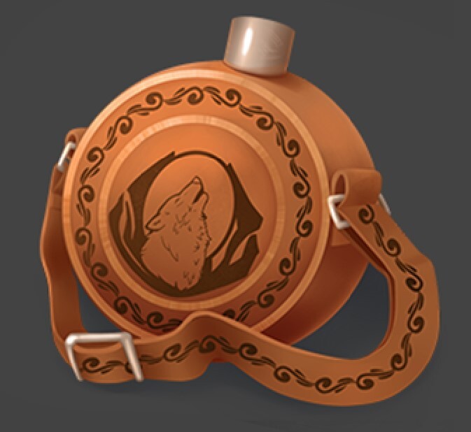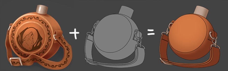 Теперь нужно доработать текстуру, добавить рим лайт и акцент на центральную часть работы. С текстурой придется чуть повозиться, так как в центре много деталей и их добавление может сделать картинку очень шумной. Поэтому нужно быть аккуратными. Плюс, чтобы материал кожи сделать более читабельным, добавим шов на боковую поверхность фляжки.