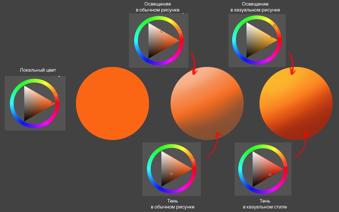 К примеру, возьмём оранжевый шарик. У него при обычном освещении тень будет оставаться оранжевой, но станет более темной и менее насыщенной. В казуальной графике у этого же оранжевого шарика в тени будут использоваться более красные цвета, а на свету более жёлтые. Т.е. чтобы сделать цвет светлее или темнее по тону мы должны также менять оттенки. За счёт этого создаётся красочность стиля.