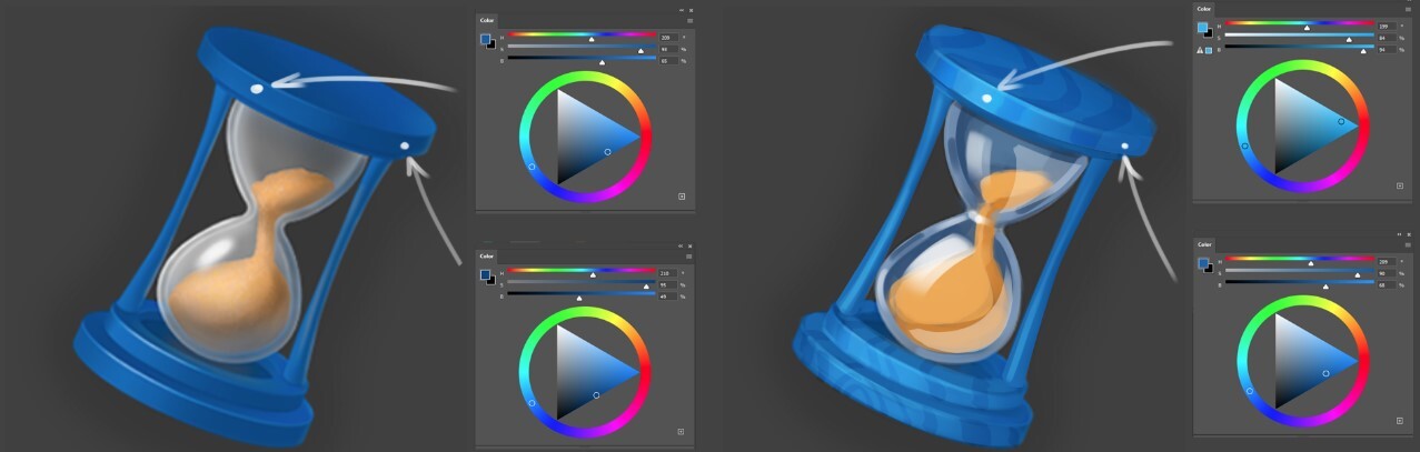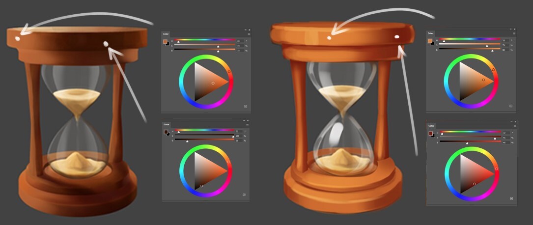 В случае оранжевого цвета, для освещенной стороны подойдет цвет ближе к желтому, а для тени — цвет ближе к красному. Также не забываем использовать насыщенные цвета.
