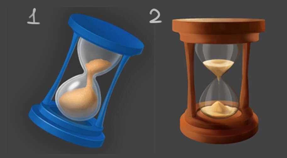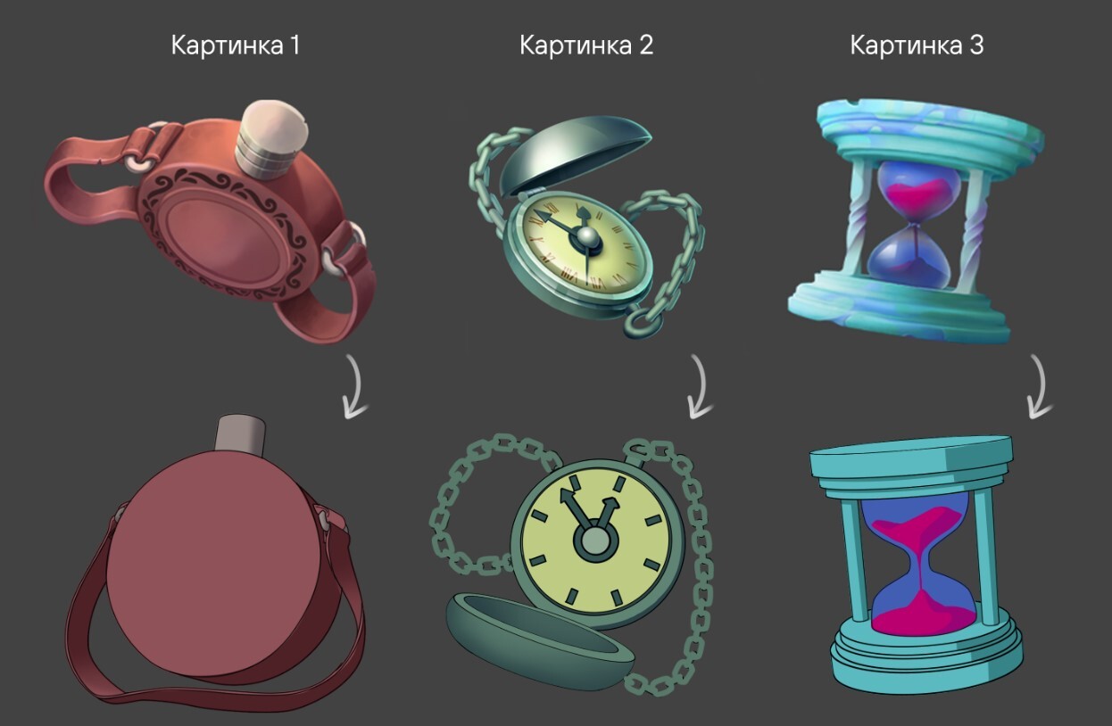 Картинка 3. Тут тоже в целом всё хорошо, но из-за того, что мы видим только фронтальную часть, хочется её немного повернуть либо на нас, либо от нас, чтобы увидеть плоскую поверхность часов. А если по центру объекта провести линии, можно заметить, что часы симметричные. Такой симметрии лучше избегать в рисунке, т.к. из-за неё он выглядит неестественным.