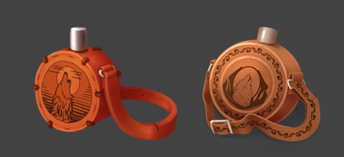 Для примера давайте возьмём одну из фляг из прошлого примера, и попробуем её улучшить, в том числе проработать материалы. Первым делом посмотрим на то, как фляга смотрится вместе с иконками на референсе.