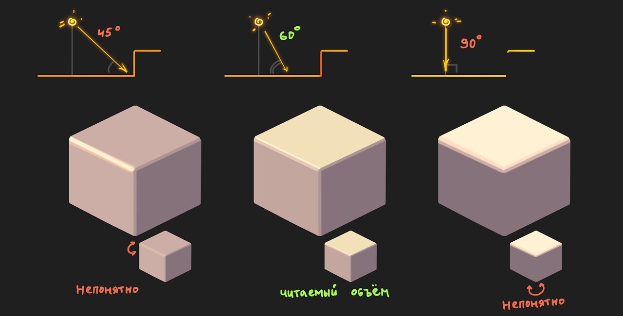 Почему именно так? Как мы можем наблюдать, при 45 градусах нижняя и боковая плоскости будут сливаться по освещенности, а при 90 (свет сверху) — будут сливаться все боковые. Также по отношению к единичному кубу свет ставят так, чтобы две боковые грани имели заметную разницу: