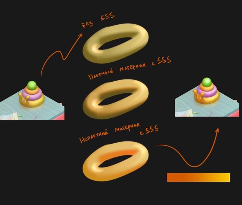 Материалы с просвечиванием. Как правило, материалы с сильным просвечиванием (пластик, ткань, солома, сыр и т.д.) имеют другой характер изображения, нежели материалы, не обладающие просвечиванием. Обычно они выглядят более воздушно и легко, нежели жесткие материалы вроде дерева и строительного камня. Хоть в реальности у таких материалов есть принципы распространения света. Чем тоньше форма и чем ближе к поверхности, через которую проходят фотоны, тем заметнее просвет. В казуальной же графике просто подсвечивают и насыщают тени по всей поверхности: